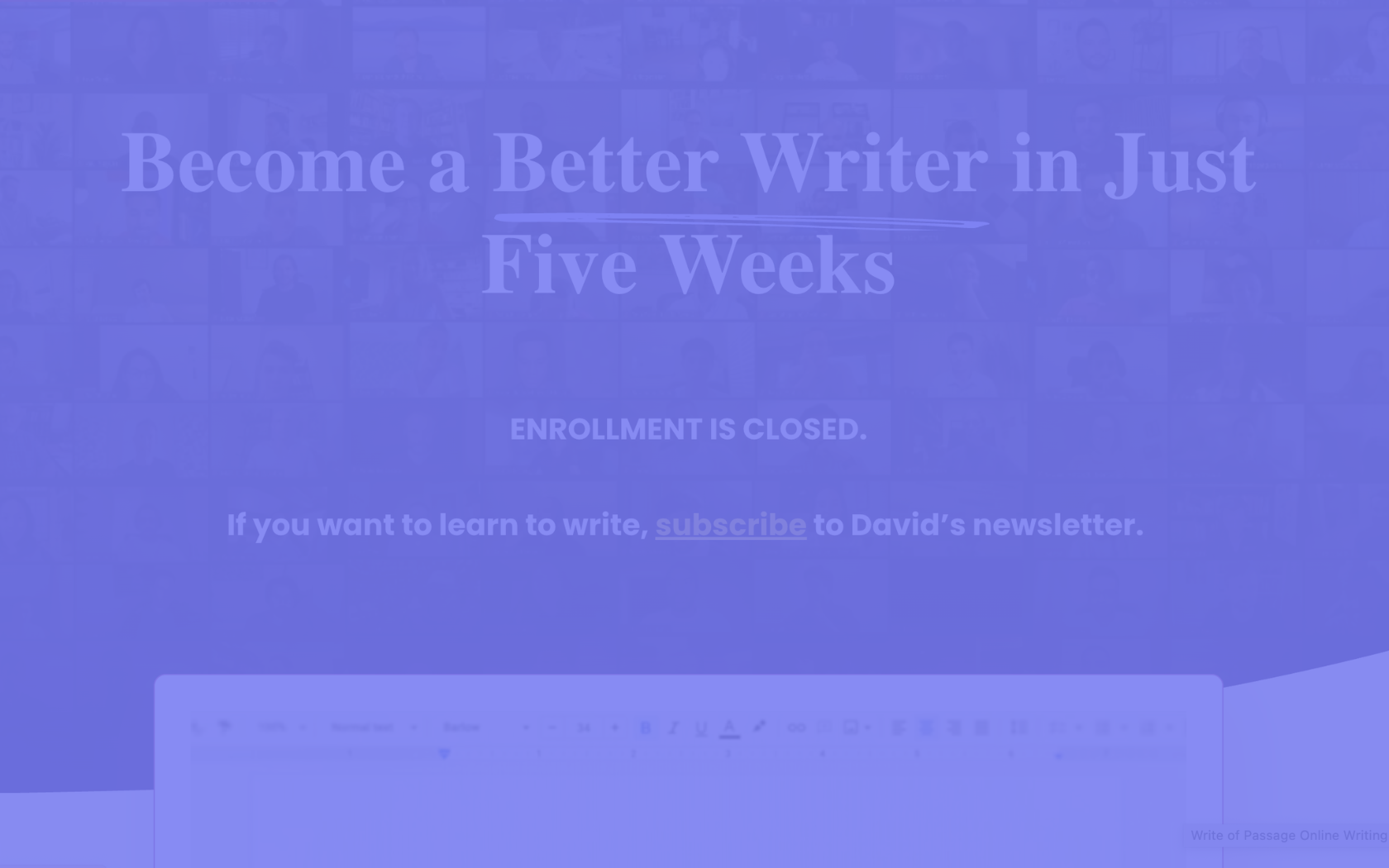 The value and impact Write of Passage had on me is immeasurable. The things that felt like blockers to consistently writing or writing with clarity slowly eroded over my cohort. Write of Passage is certainly the opening pages of a new chapter in my life.